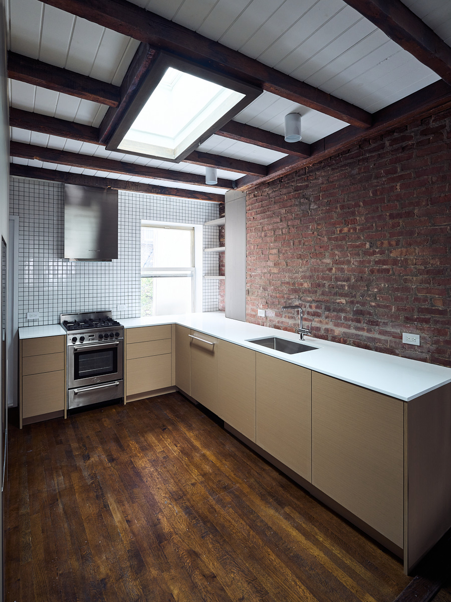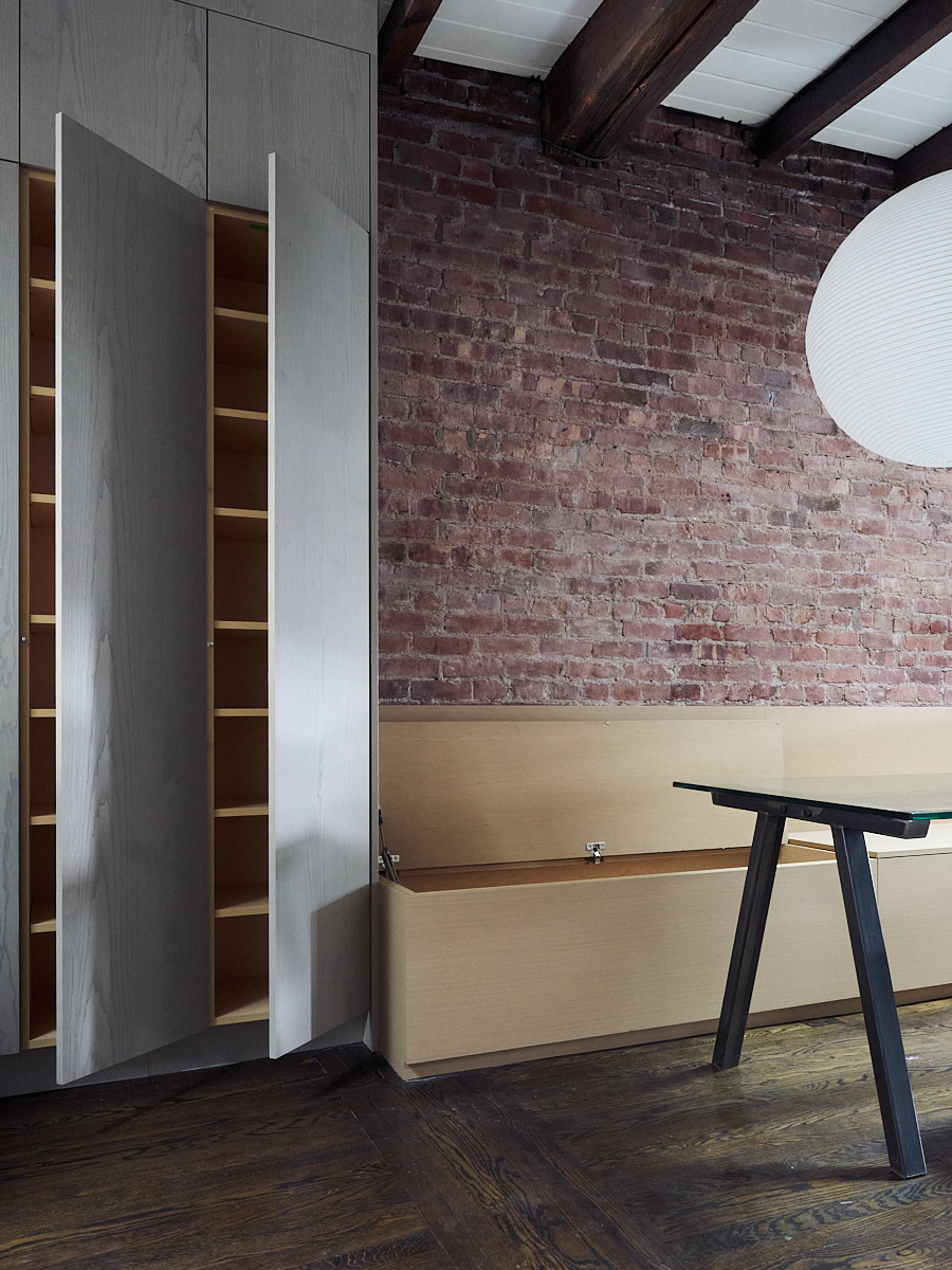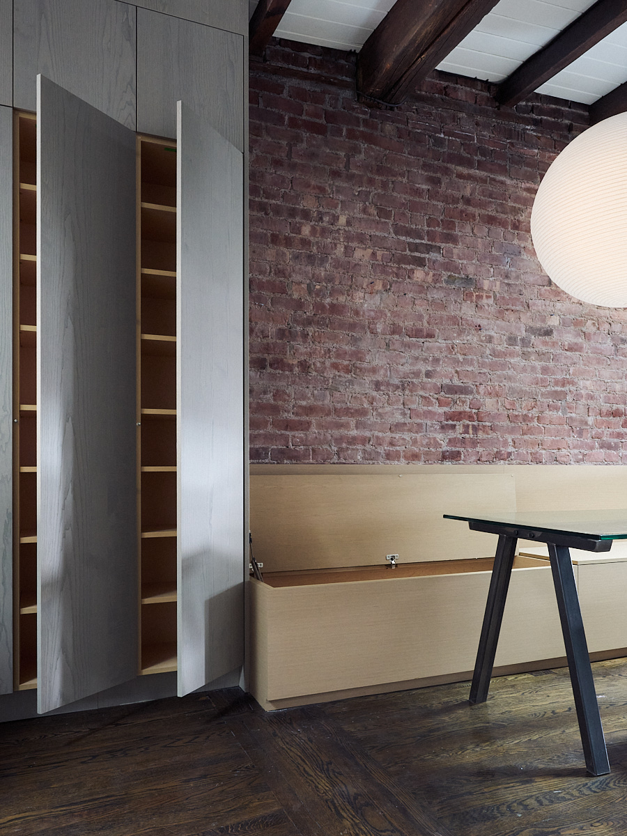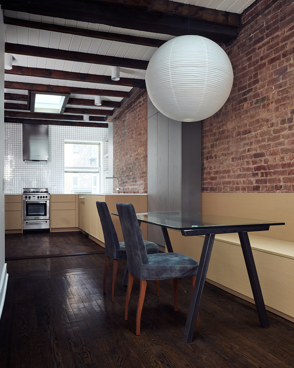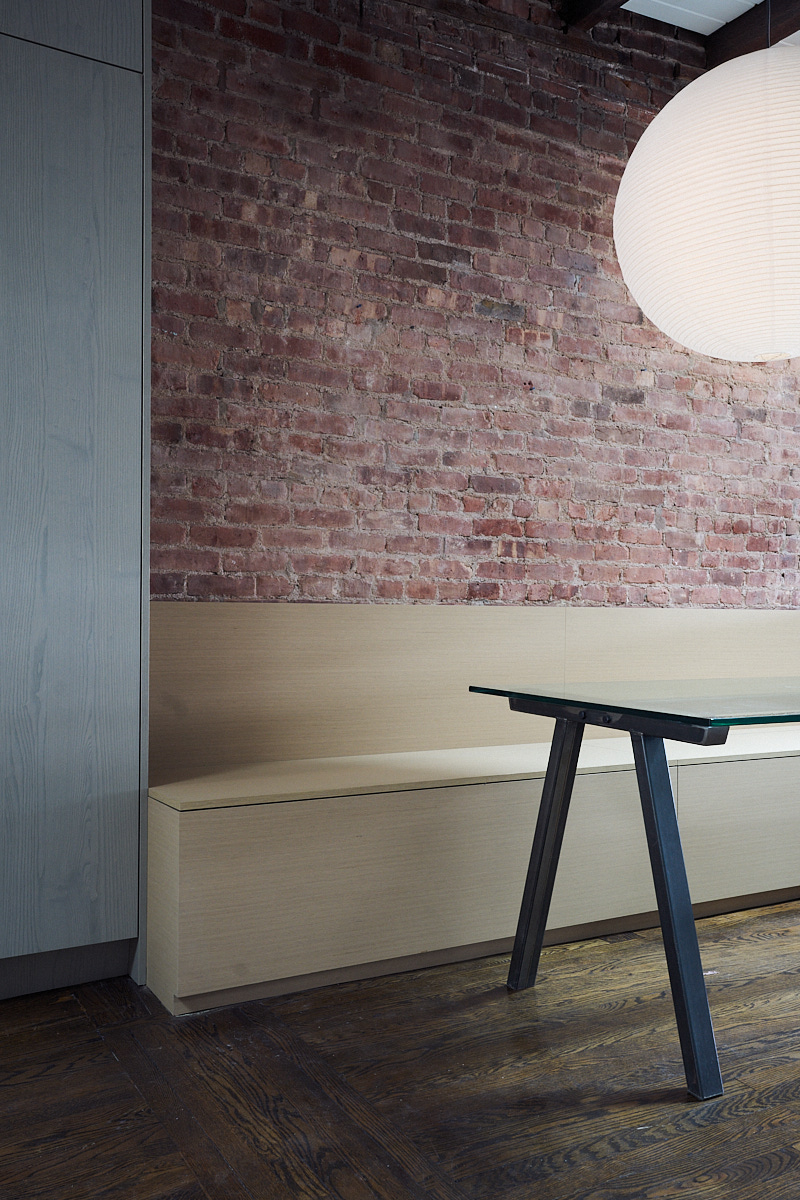 A beautifully updated galley kitchen that celebrates the apartment’s historic exposed brick, featuring custom gray millwork, warm wood floors, and a cozy built-in dining nook.