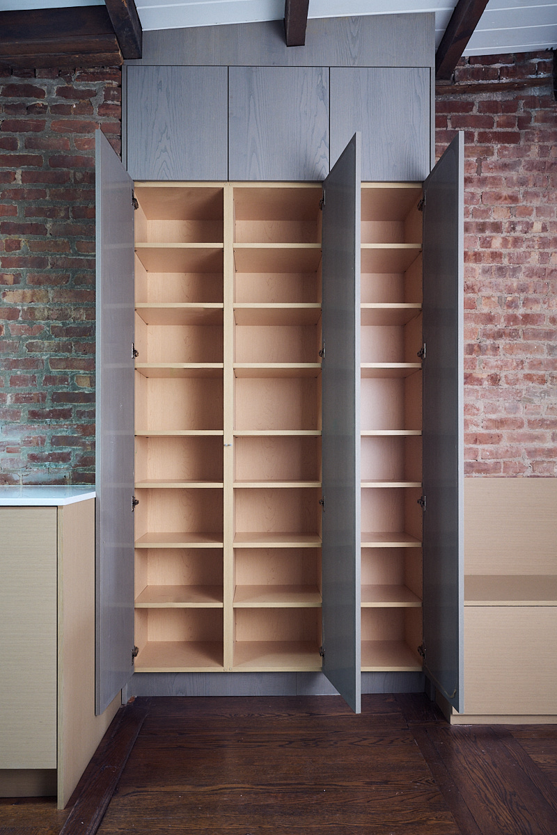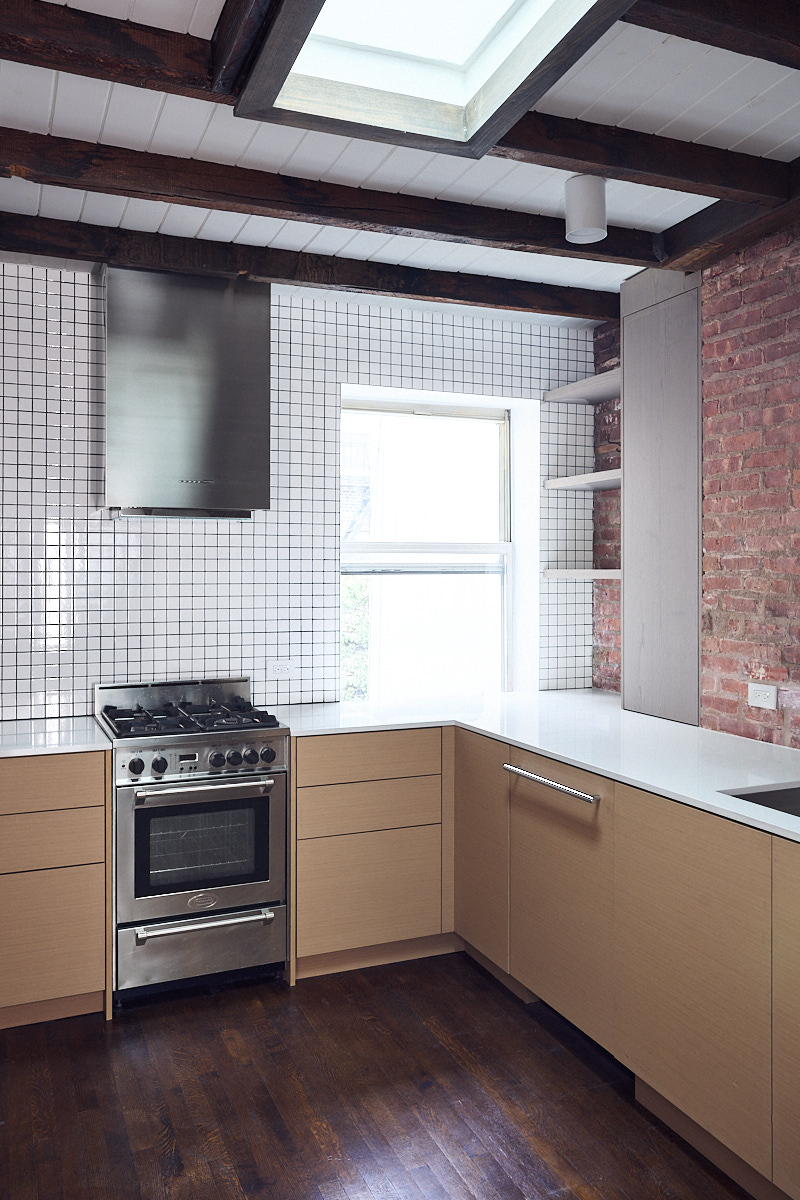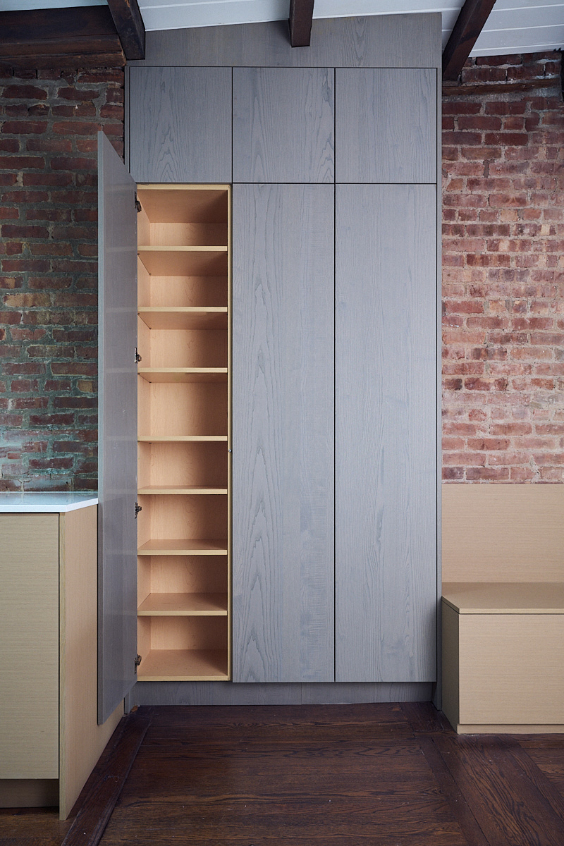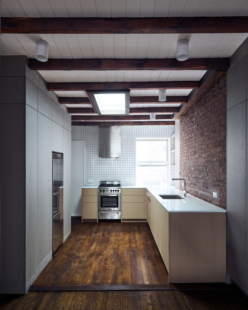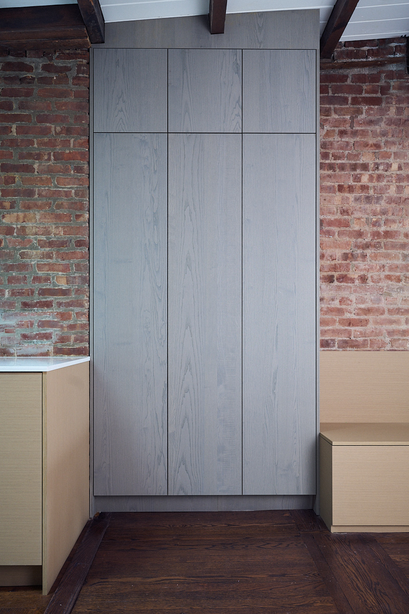 A beautifully updated galley kitchen that celebrates the apartment’s historic exposed brick, featuring custom gray millwork, warm wood floors, and a cozy built-in dining nook.