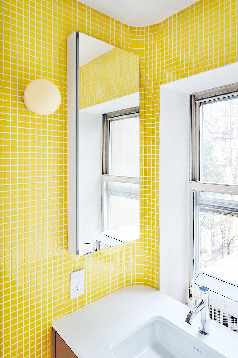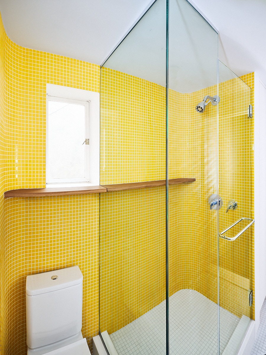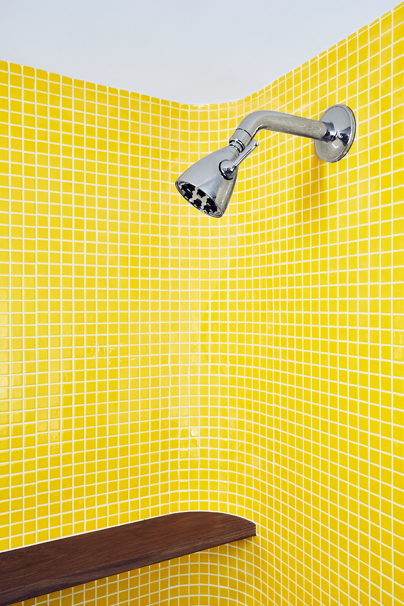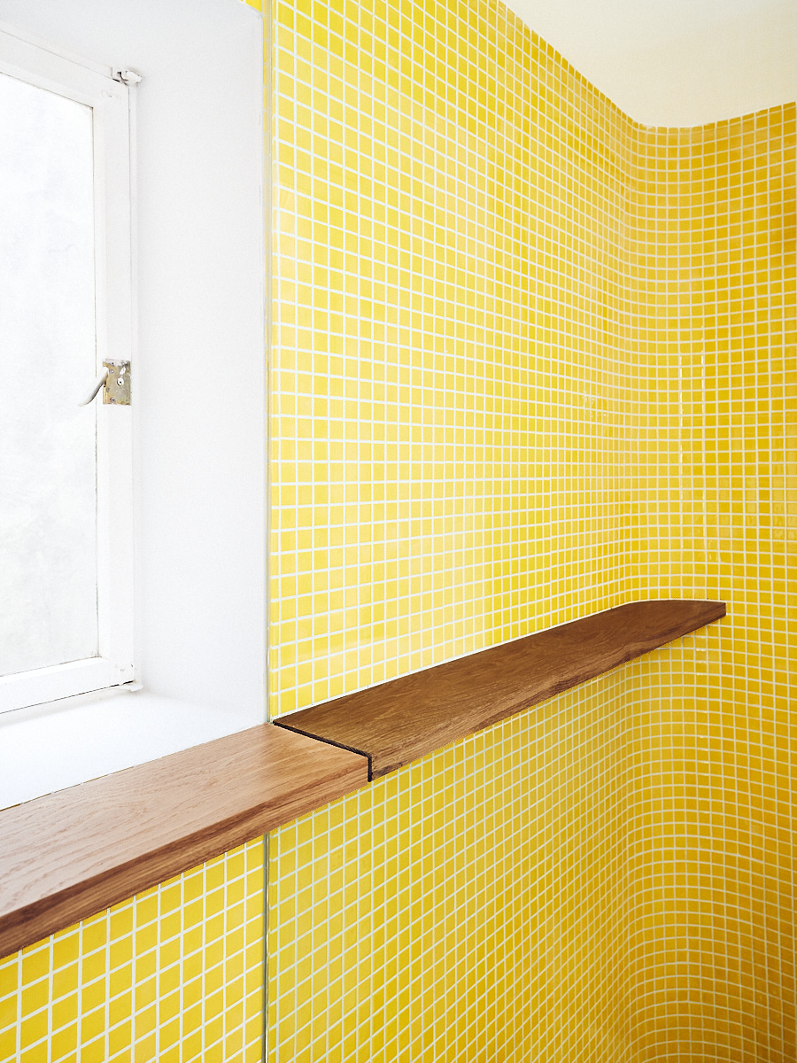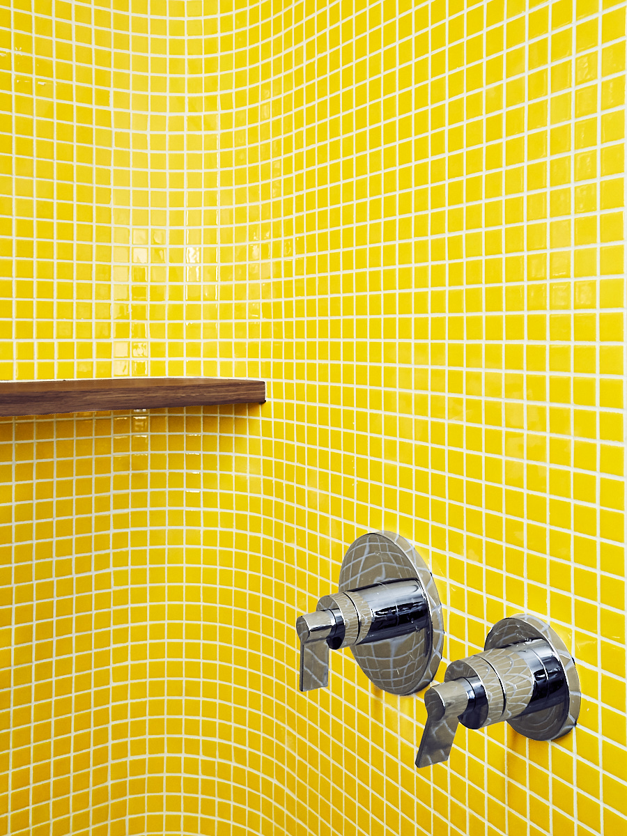 A vibrant and architecturally unique space showcasing striking yellow tilework alongside curved, organic lines and bespoke modern finishings.
