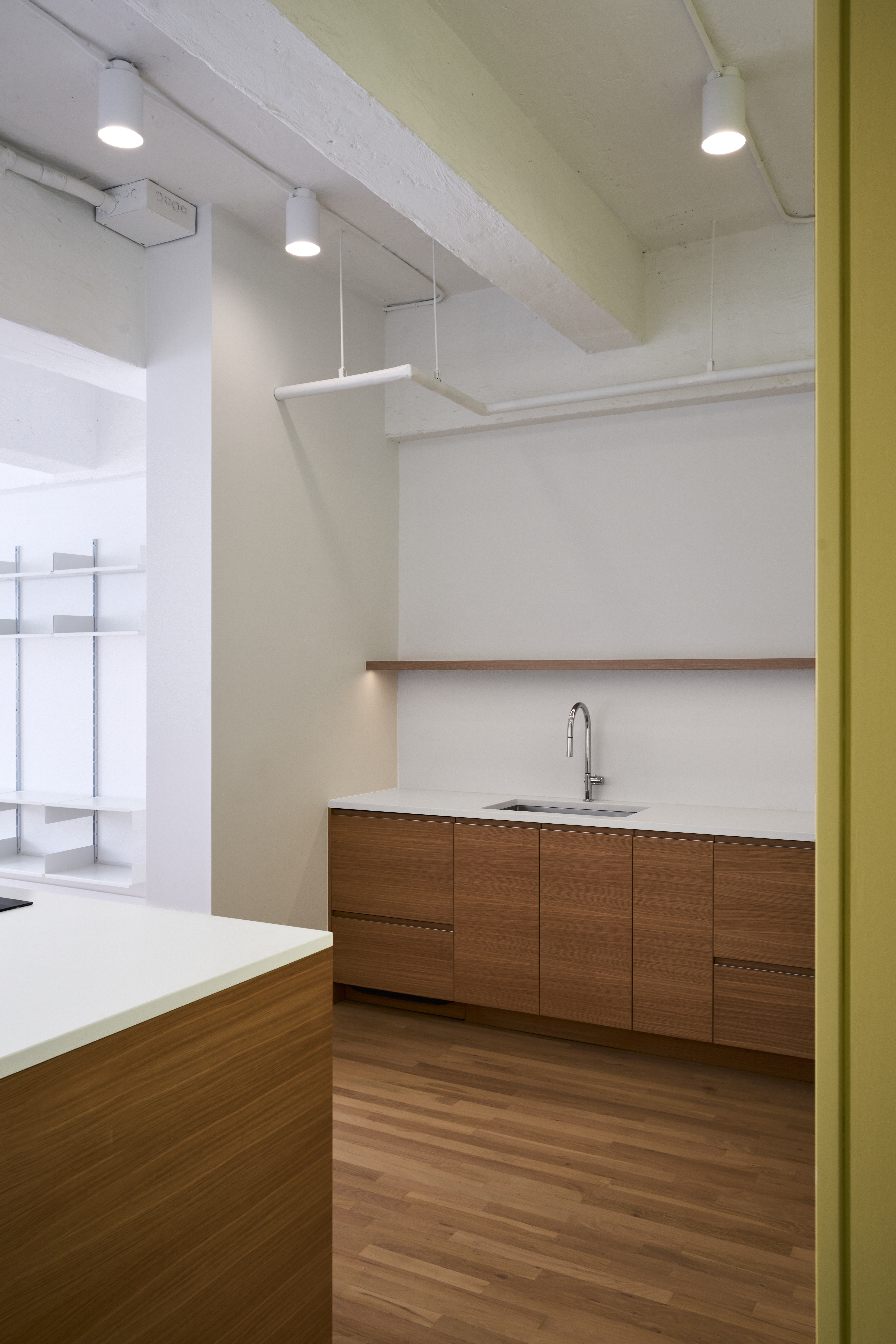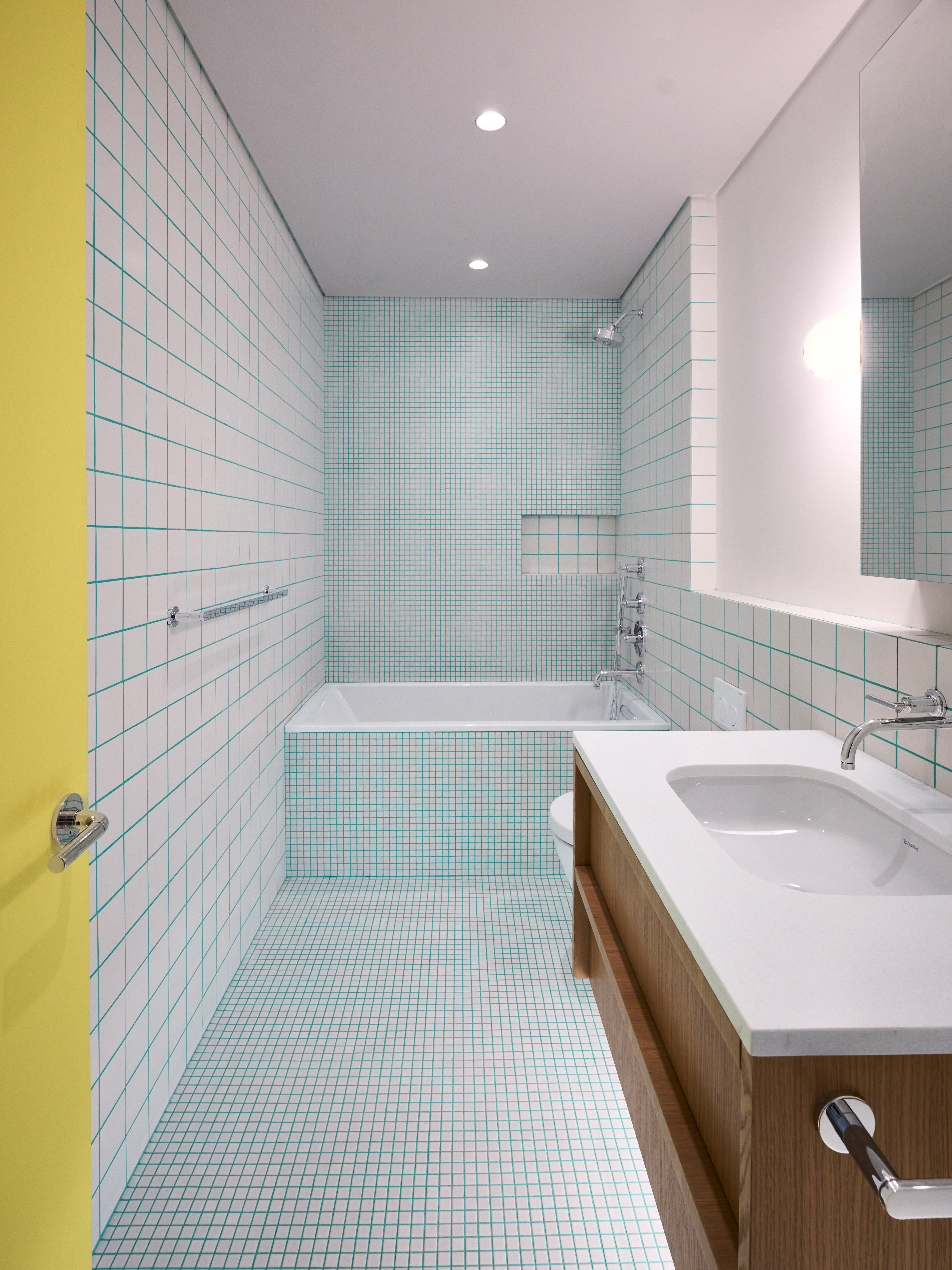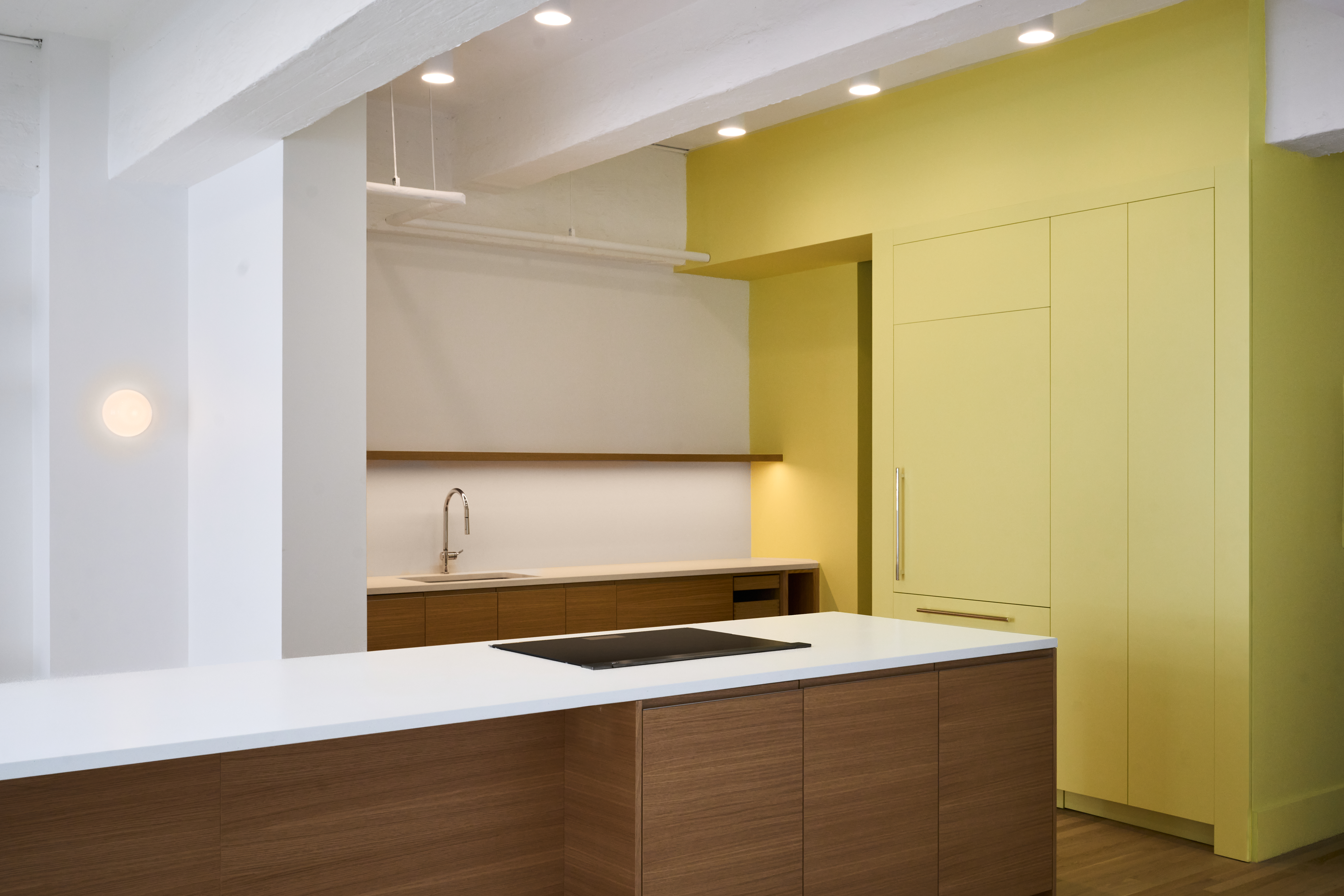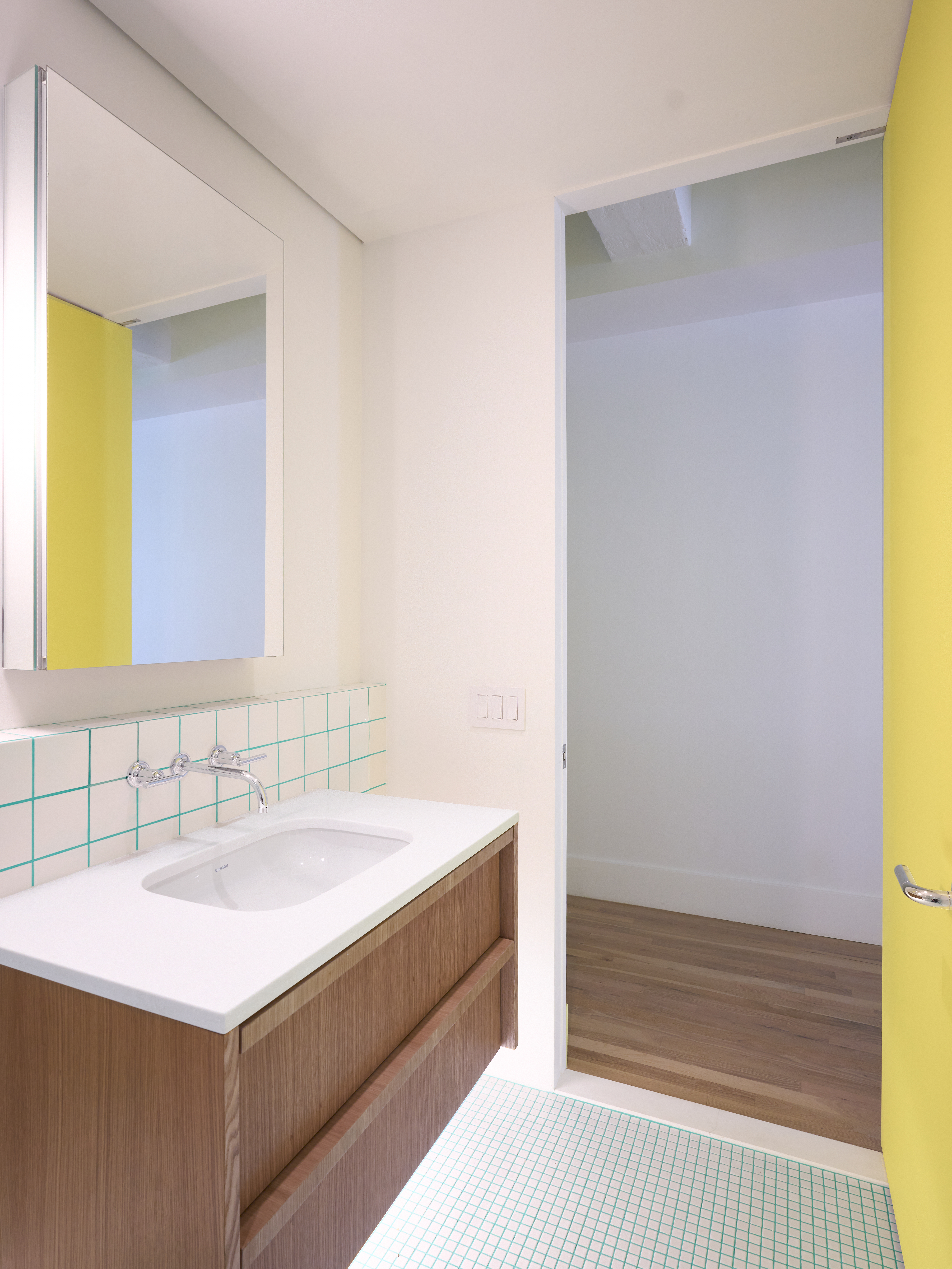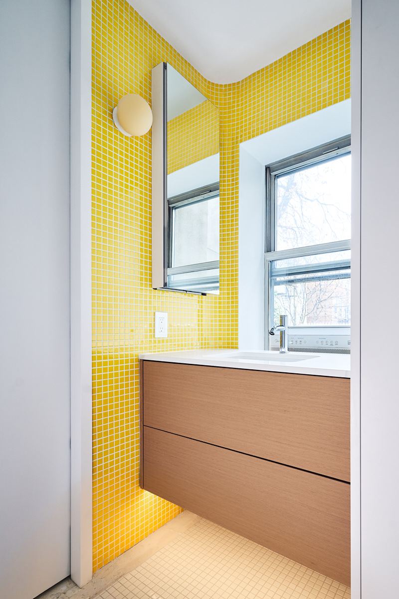 A vibrant and architecturally unique space showcasing striking yellow tilework alongside curved, organic lines and bespoke modern finishings.