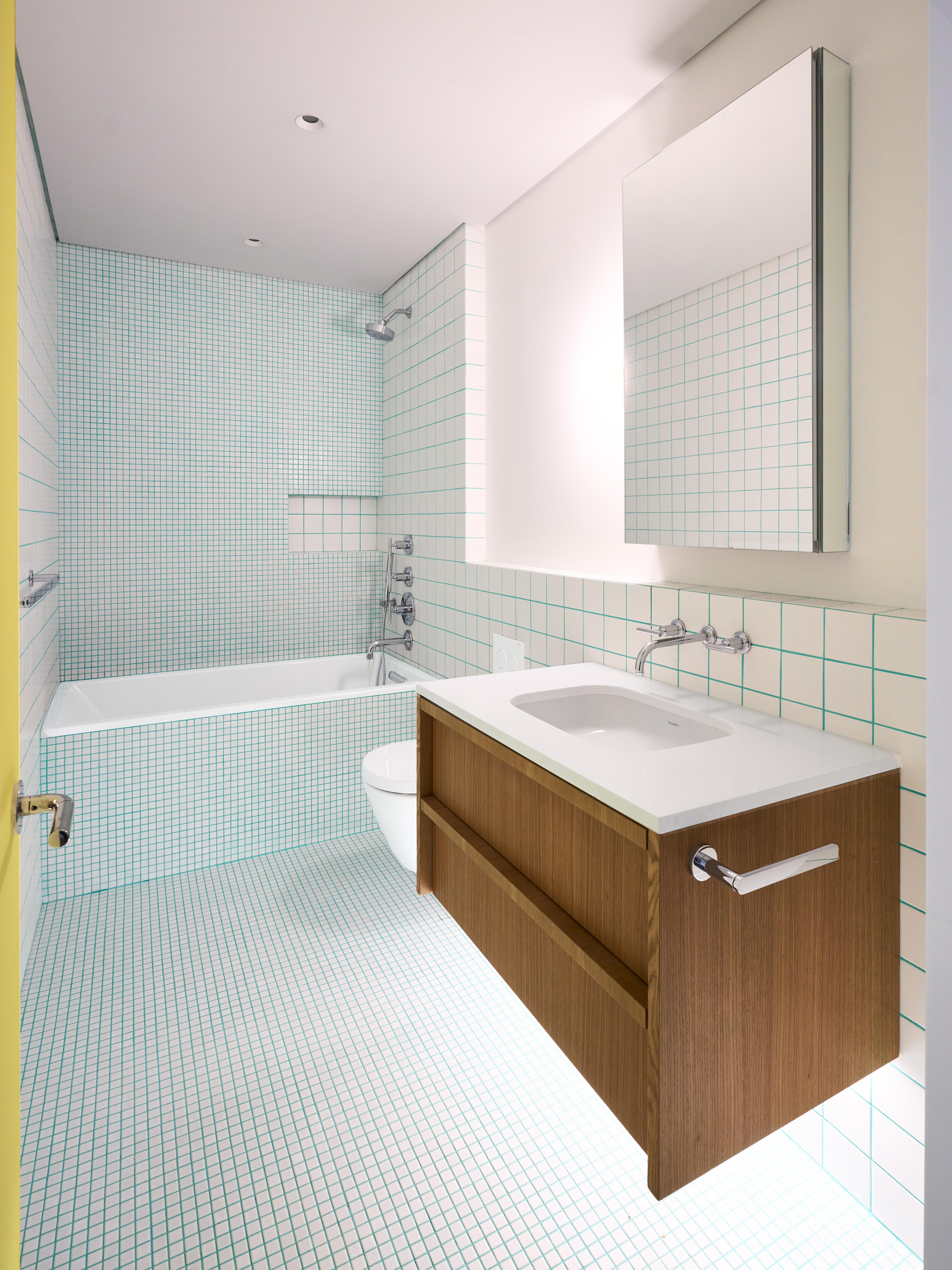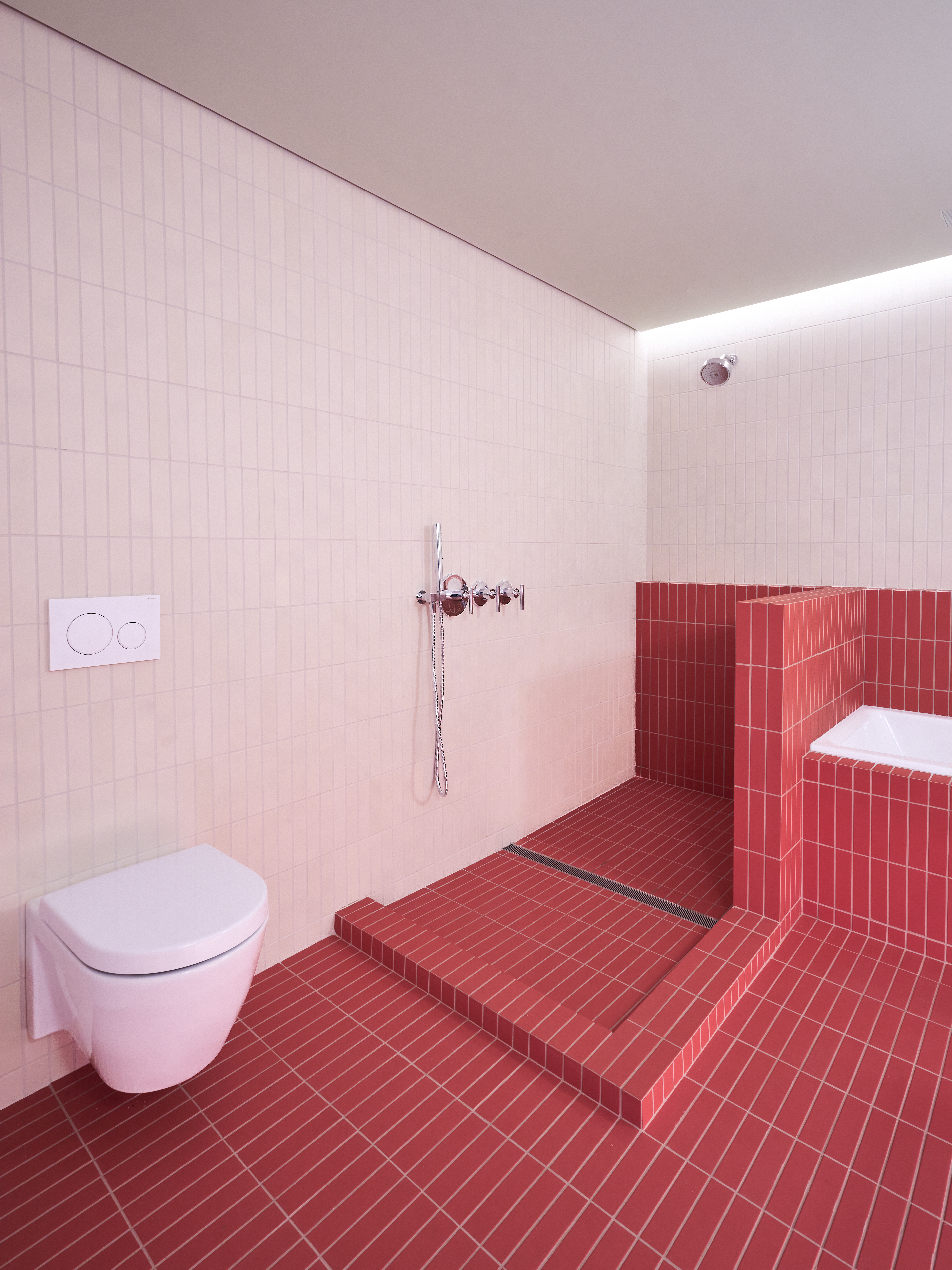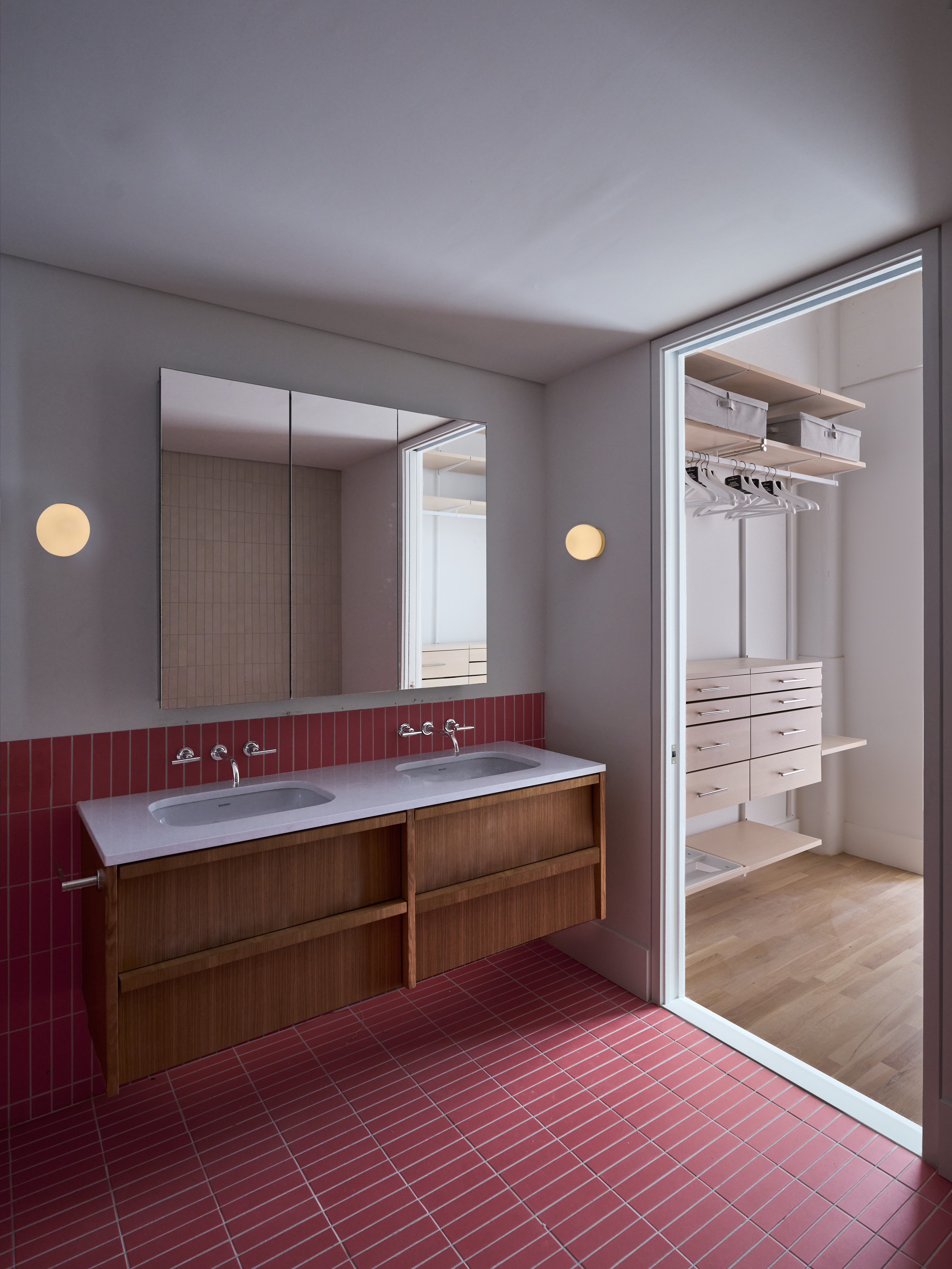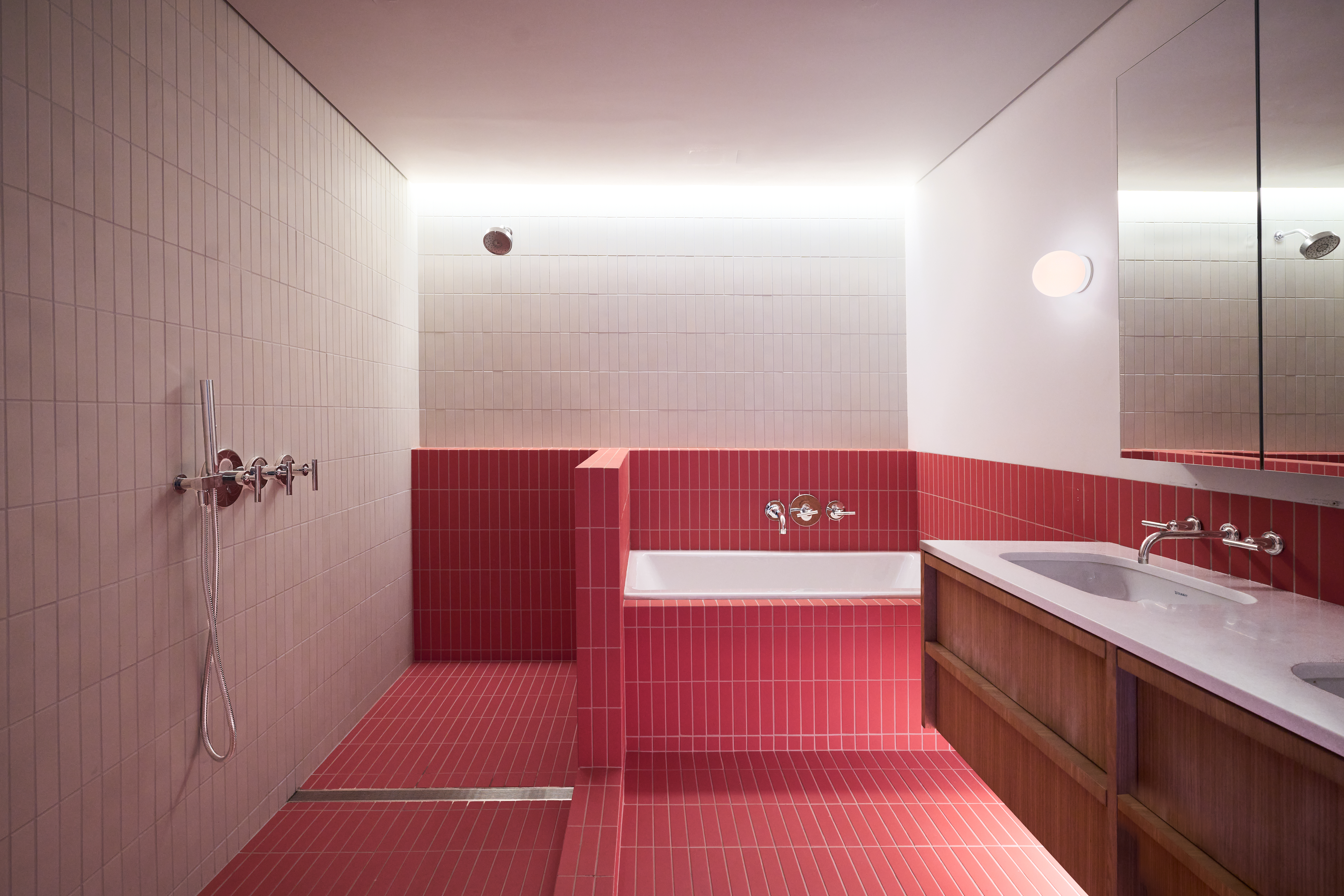 A bold and playful design featuring custom pink tiling and elegant fixtures, creating a vibrant yet sophisticated space that maximizes both style and functionality.